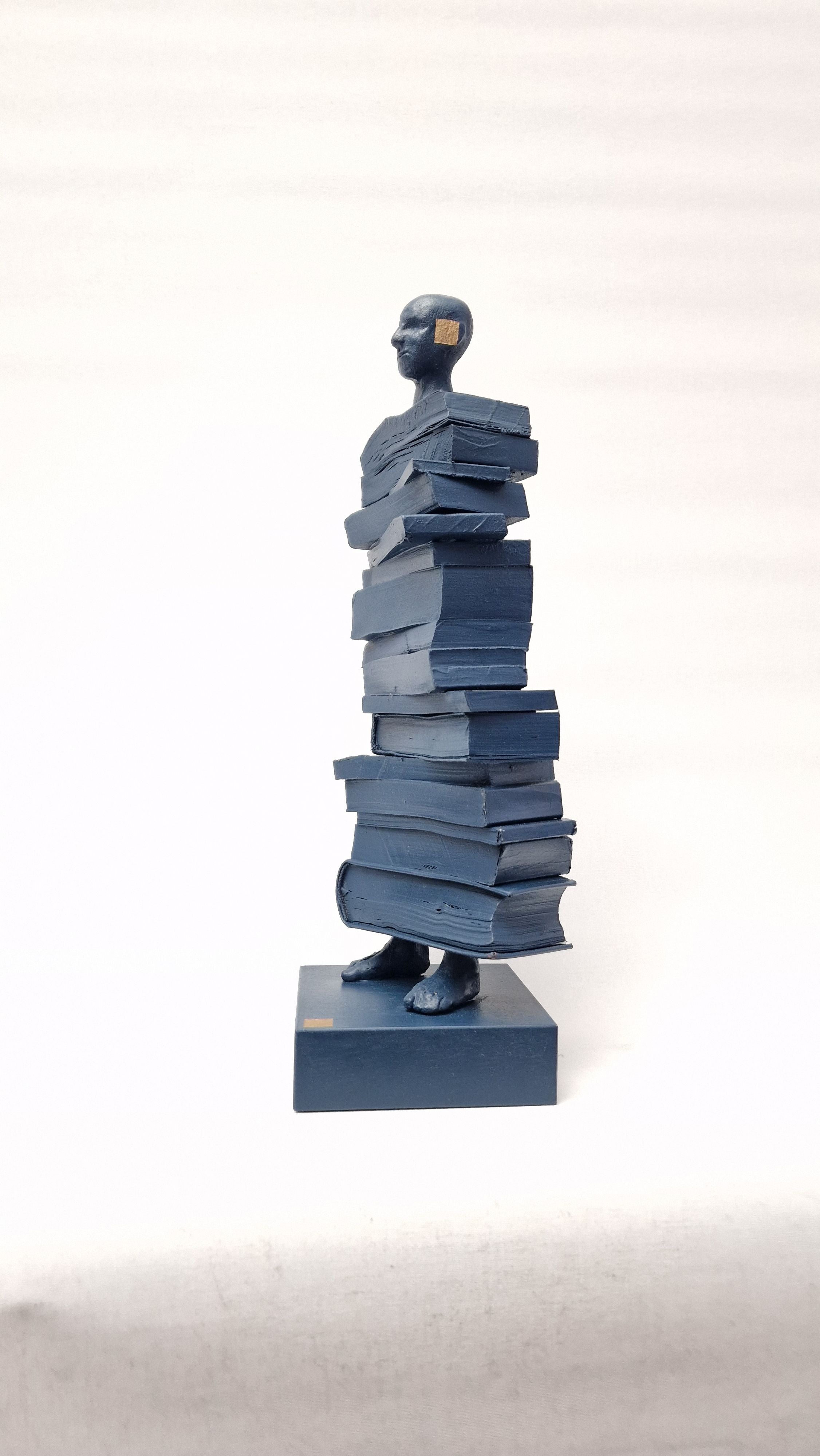 Homo Libri - ce que je lis me construit - Sculpture en livres, plâtre, pigments, dorure, fer et bois. Pièce unique, signée par l'artiste et livrée avec un certificat d'authenticité.