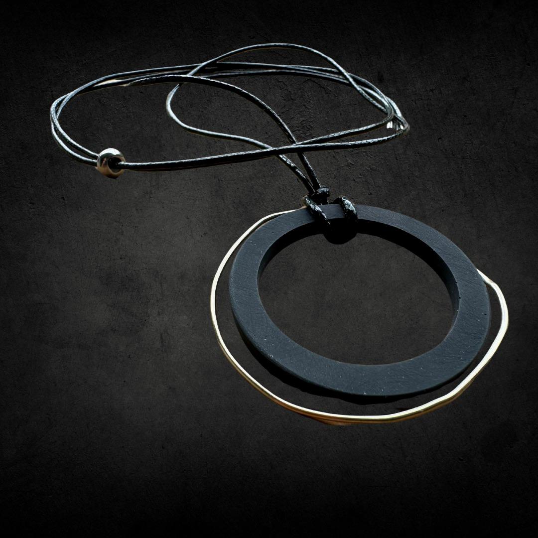 Pendentif en béton et argent. Cordon noir de 30 cm