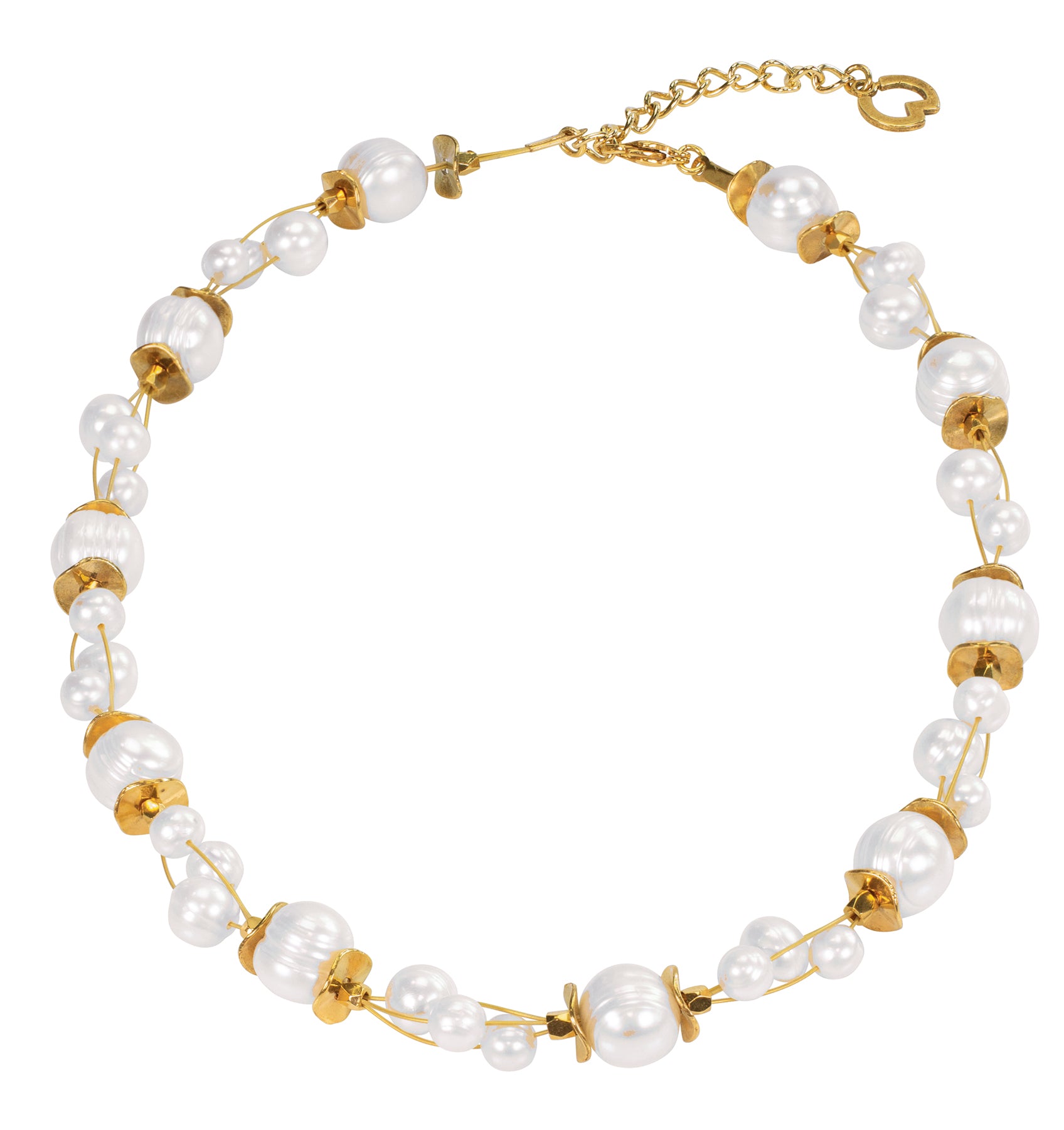 Des perles d'eau douce de différentes tailles, enfilées sur de délicats fils en acier inoxydable, composent un collier de perles varié et moderne. Chaque perle a été façonnée de manière unique par la nature, rendant chaque collier unique. Des plaquettes ondulées en laiton plaqué or 24 carats apportent une touche originale. Avec fermoir mousqueton. Longueur réglable de 42 à 47,5 cm. Le diamètre des perles varie de 6 à 11,5 mm.