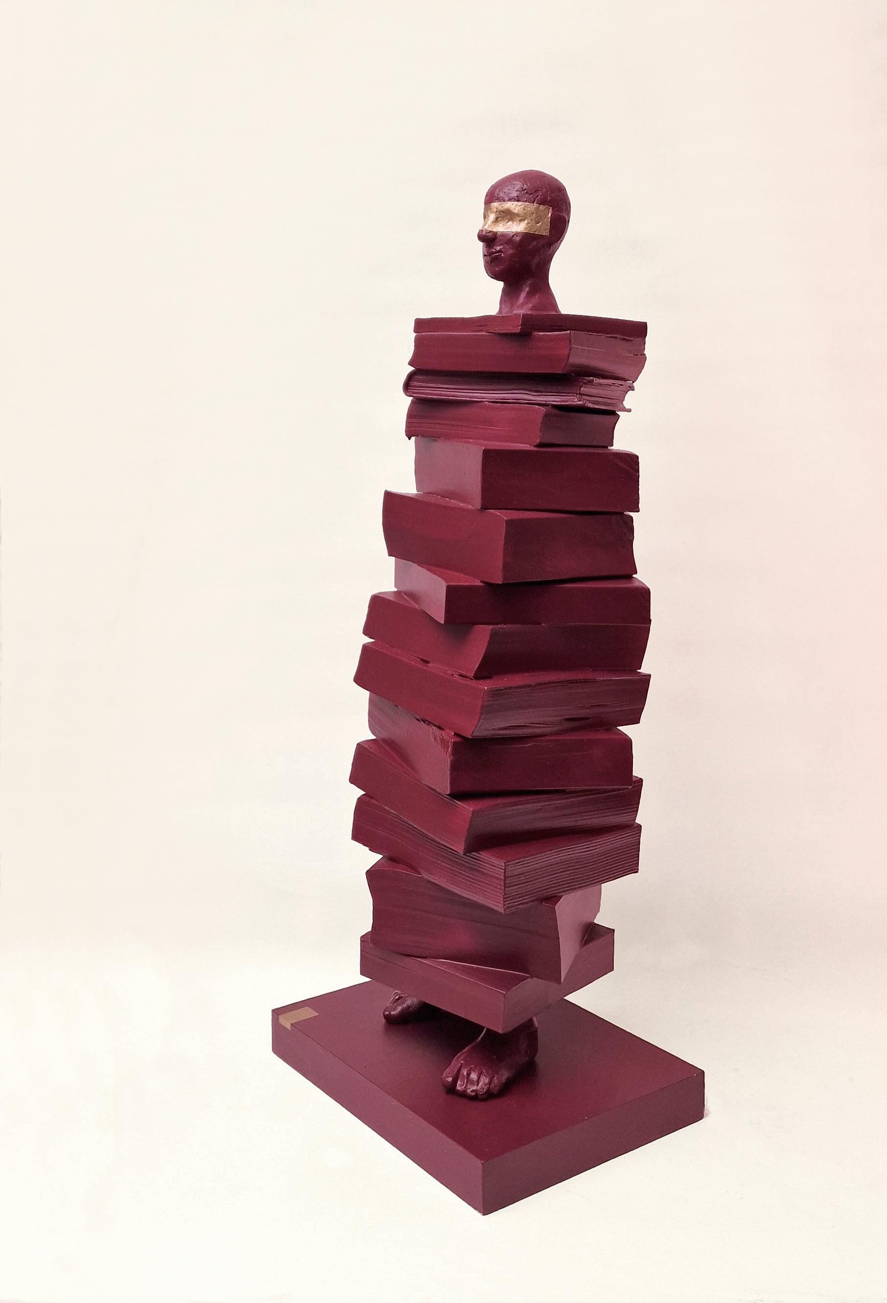 de la série "Homo Libri - ce que je lis me construit. Sculpture en libres, bois, plâtre, pigments et dorure. 19 x 24 x 61 cm. Pièce unique!!