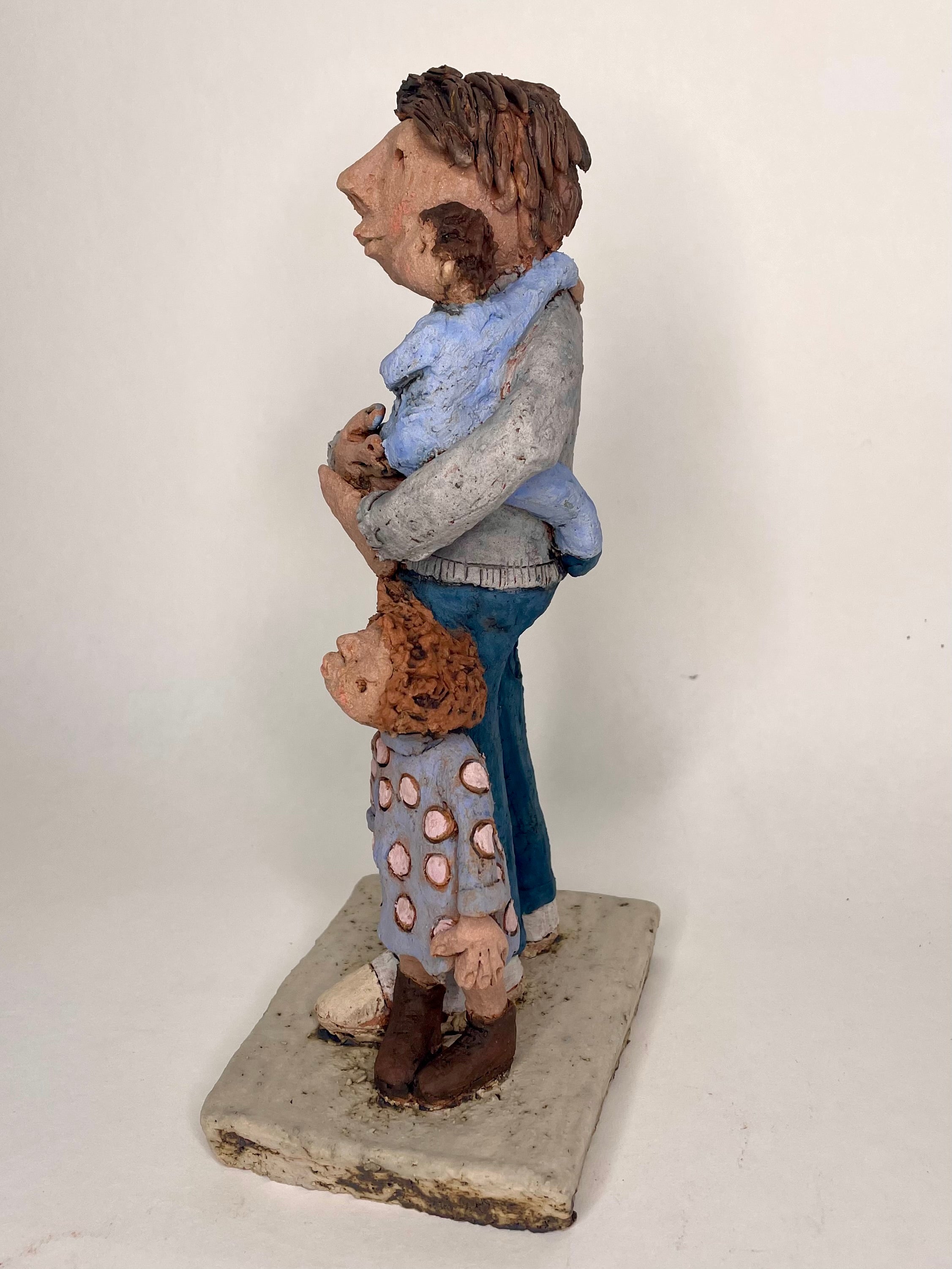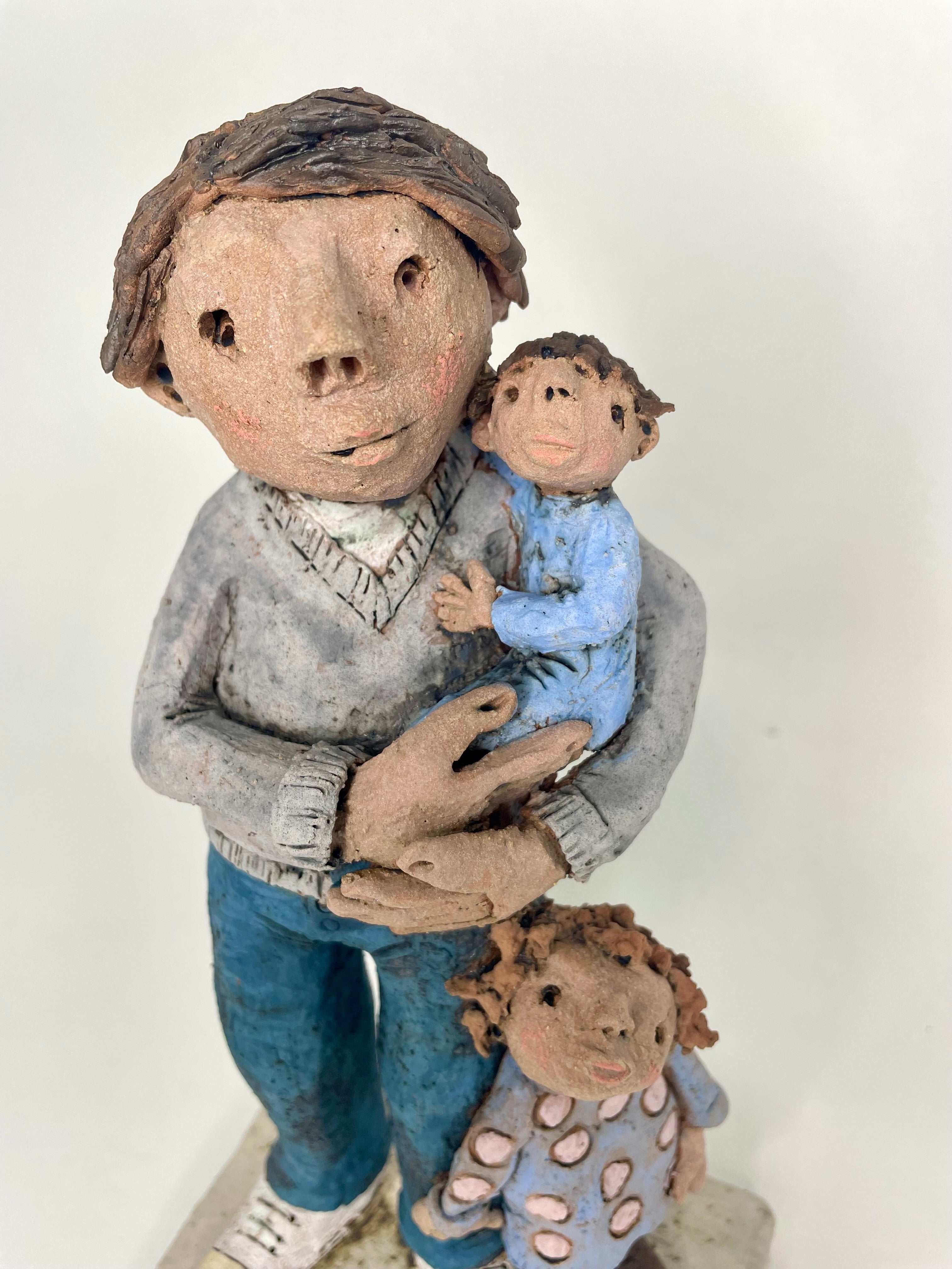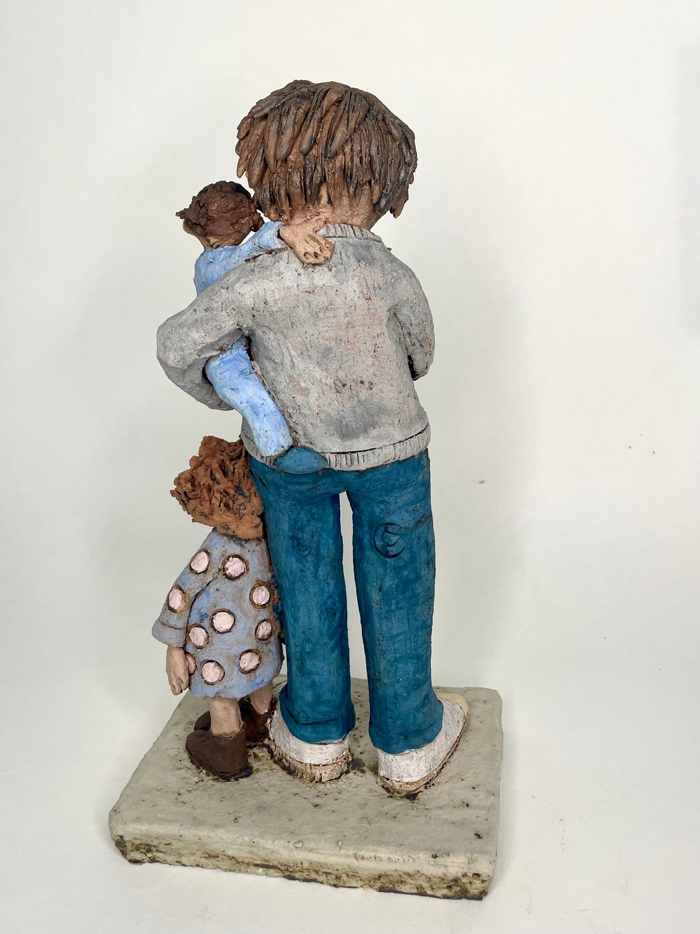 Pièce unique réalisée à la main, construite selon la technique du boudin et de la plaque et cuite plusieurs fois à basse température (1100°) dans un four à céramique. La finition de la surface a été réalisée avec des engobes et des oxydes (élément métallique et cordon de coton) La sculpture est munie d'un cachet d'authenticité. Elle est accompagnée d'une plaque nominative en céramique réalisée à la main.