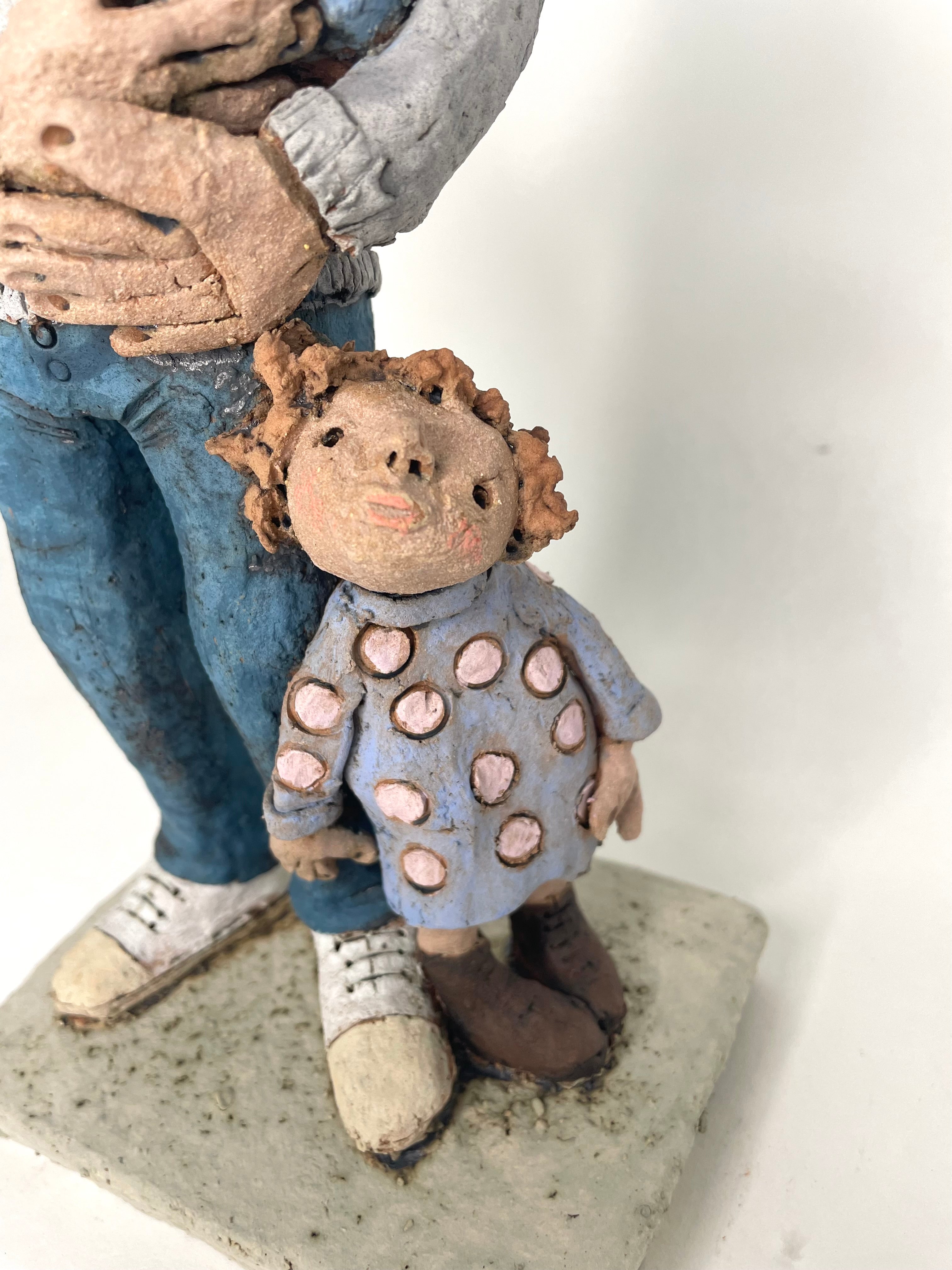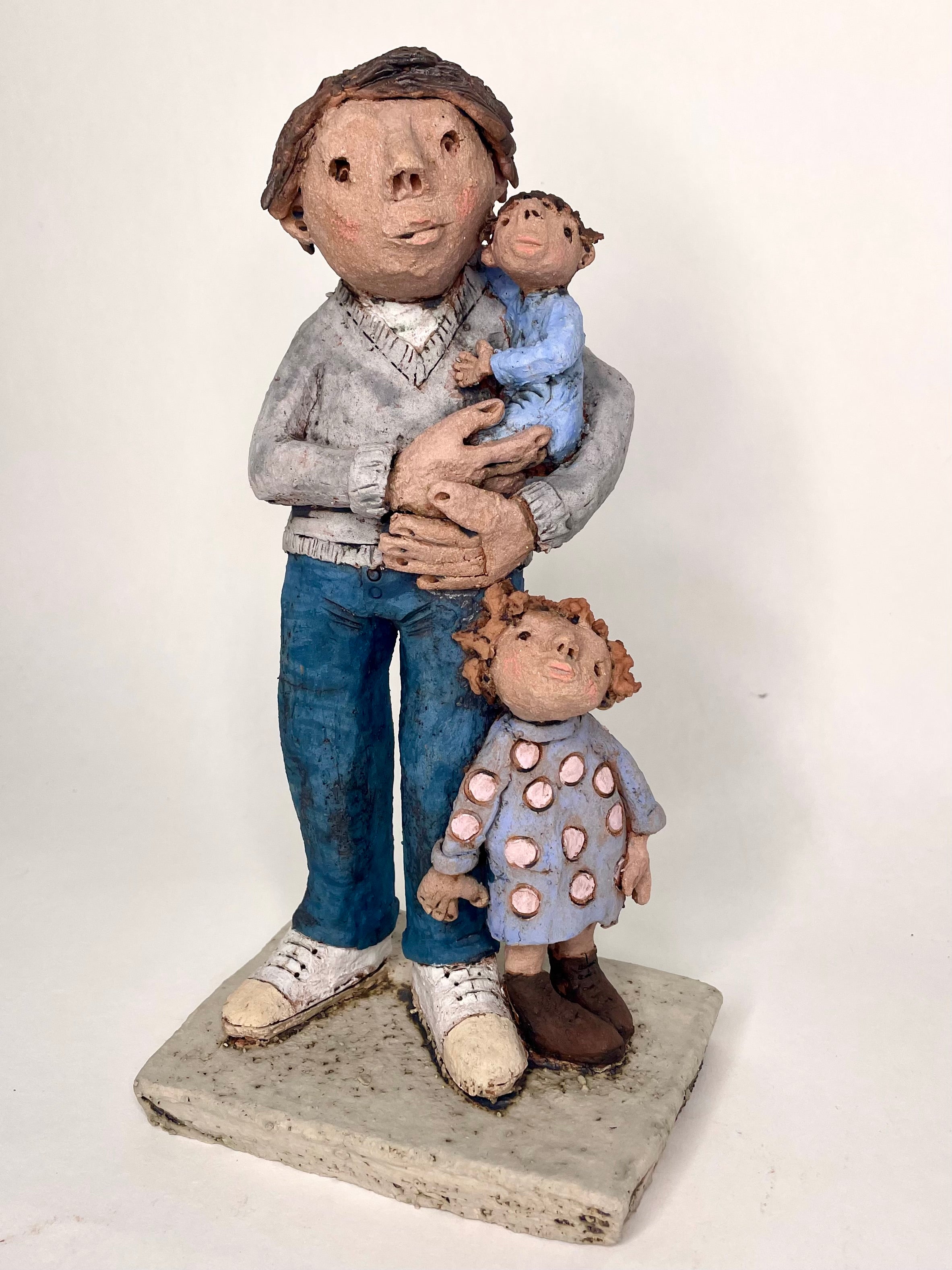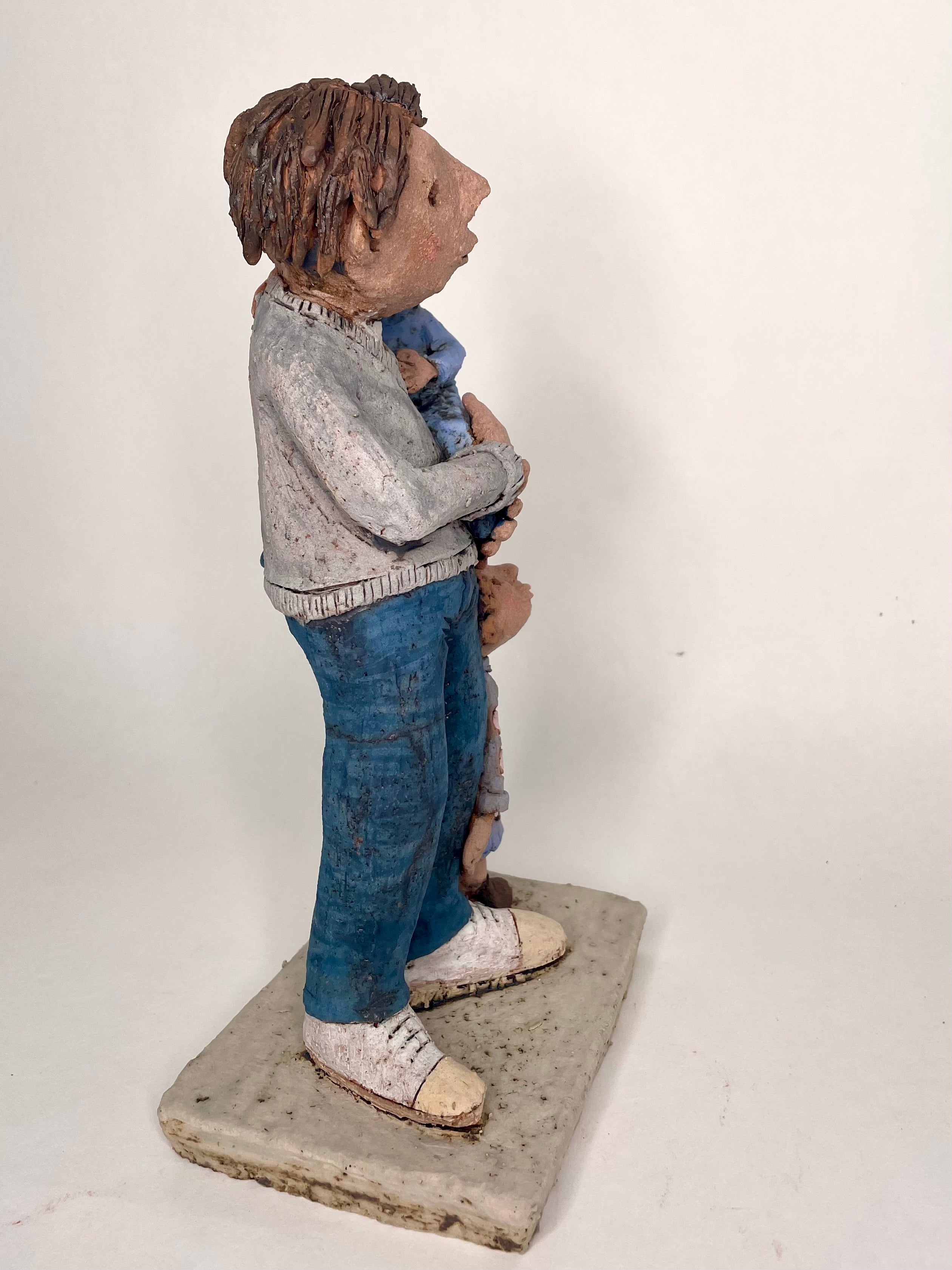Pièce unique réalisée à la main, construite selon la technique du boudin et de la plaque et cuite plusieurs fois à basse température (1100°) dans un four à céramique. La finition de la surface a été réalisée avec des engobes et des oxydes (élément métallique et cordon de coton) La sculpture est munie d'un cachet d'authenticité. Elle est accompagnée d'une plaque nominative en céramique réalisée à la main.